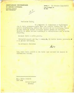 Let. a L.B. da Aldo [Moro] su carta intestata Associazioni Universitarie di Azione Cattolica. Presidenza Centrale degli universitari, Roma, 10.10.1940