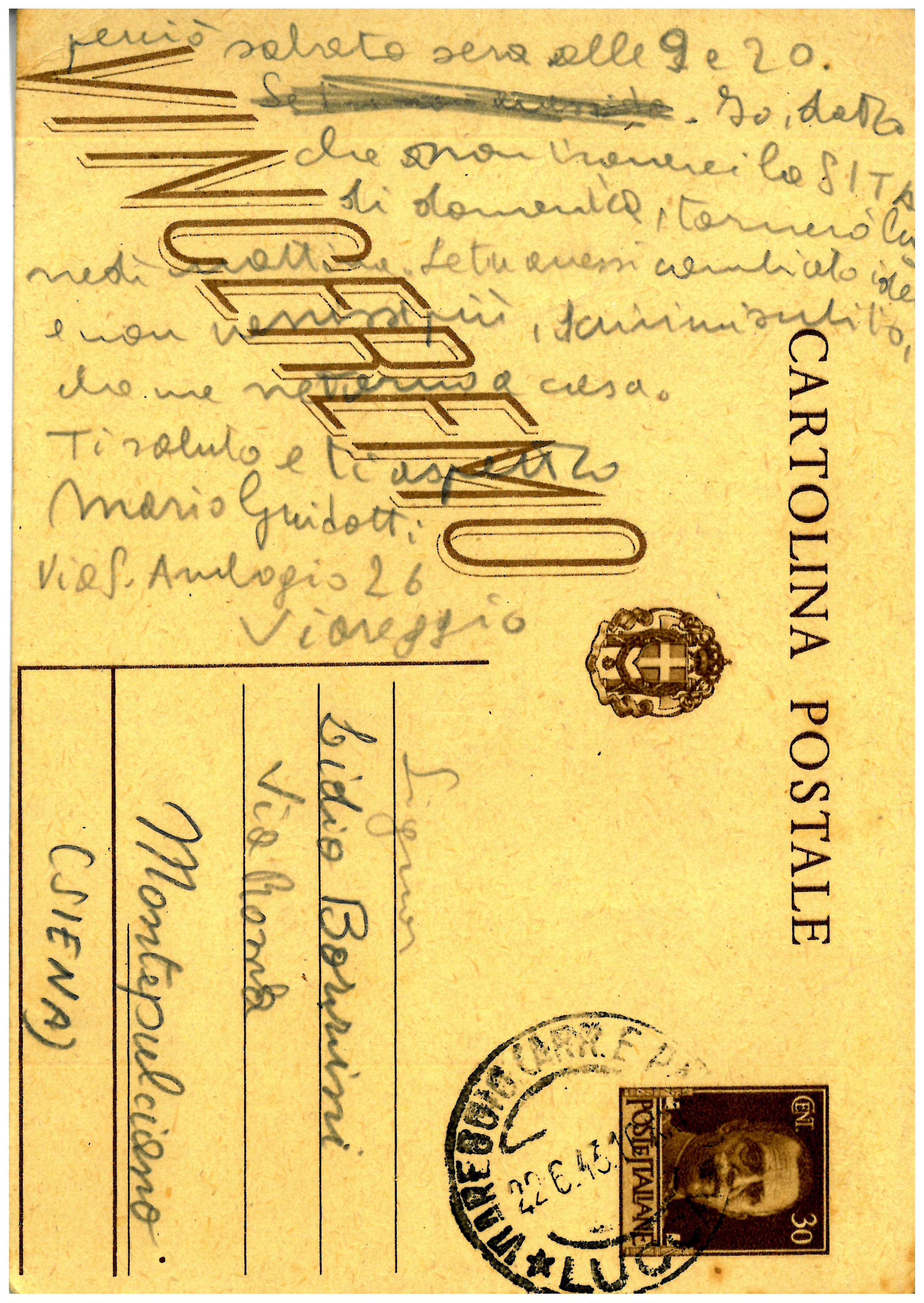 Cart. post. a L.B. da Mario Guidotti, Viareggio, 22.6.1943 (data ricavata dal timbro postale)