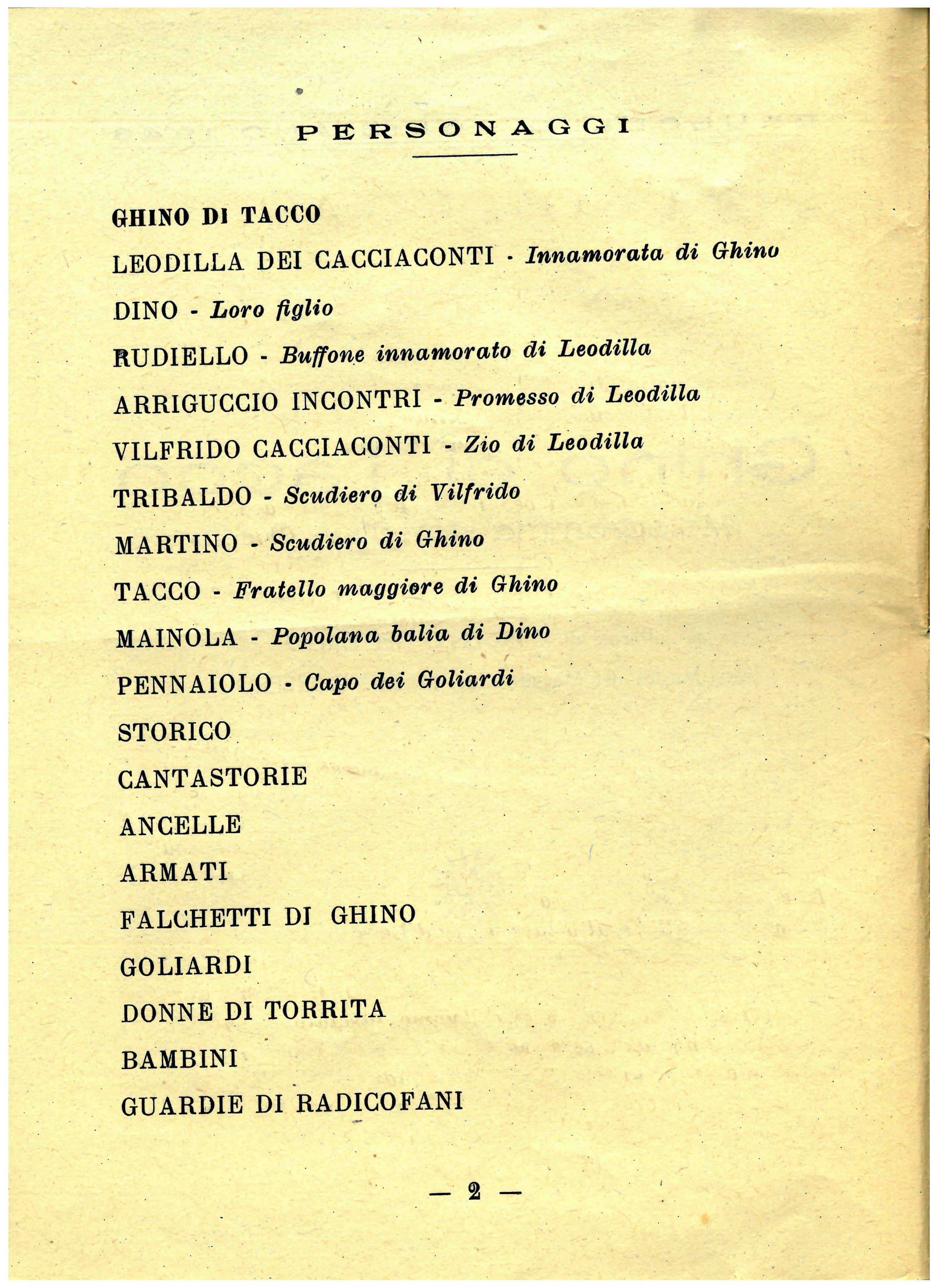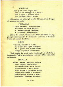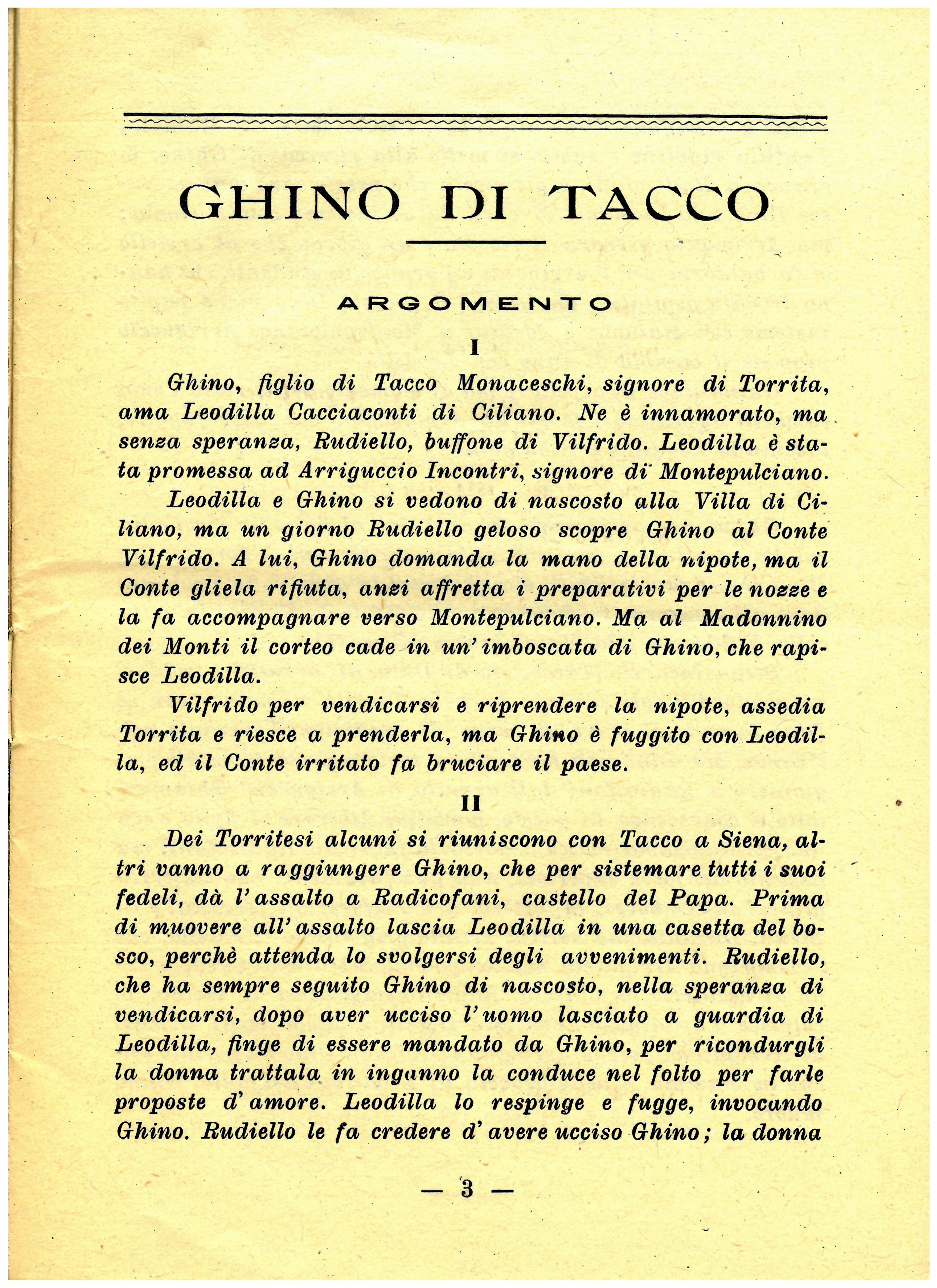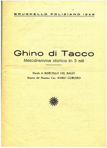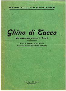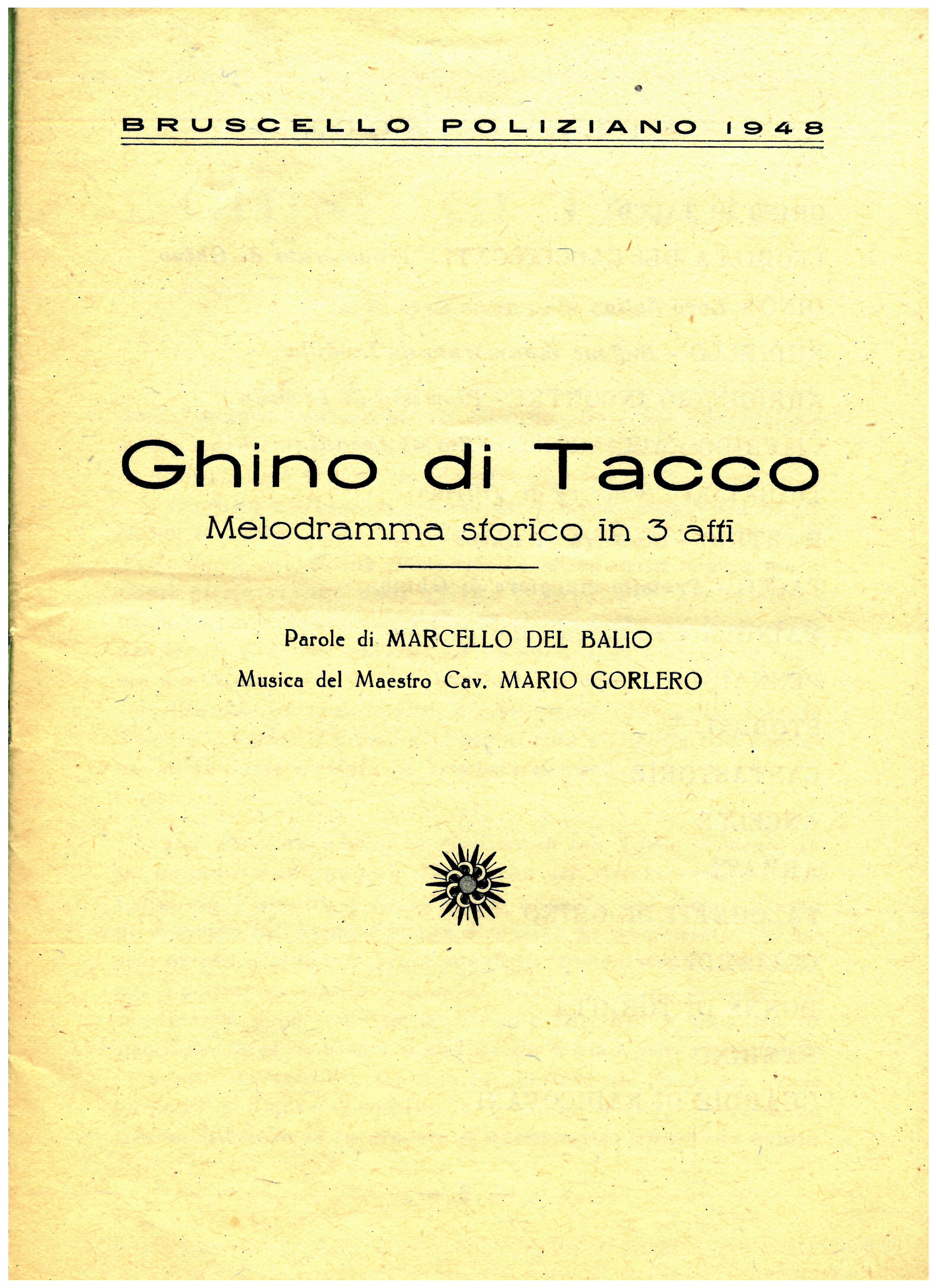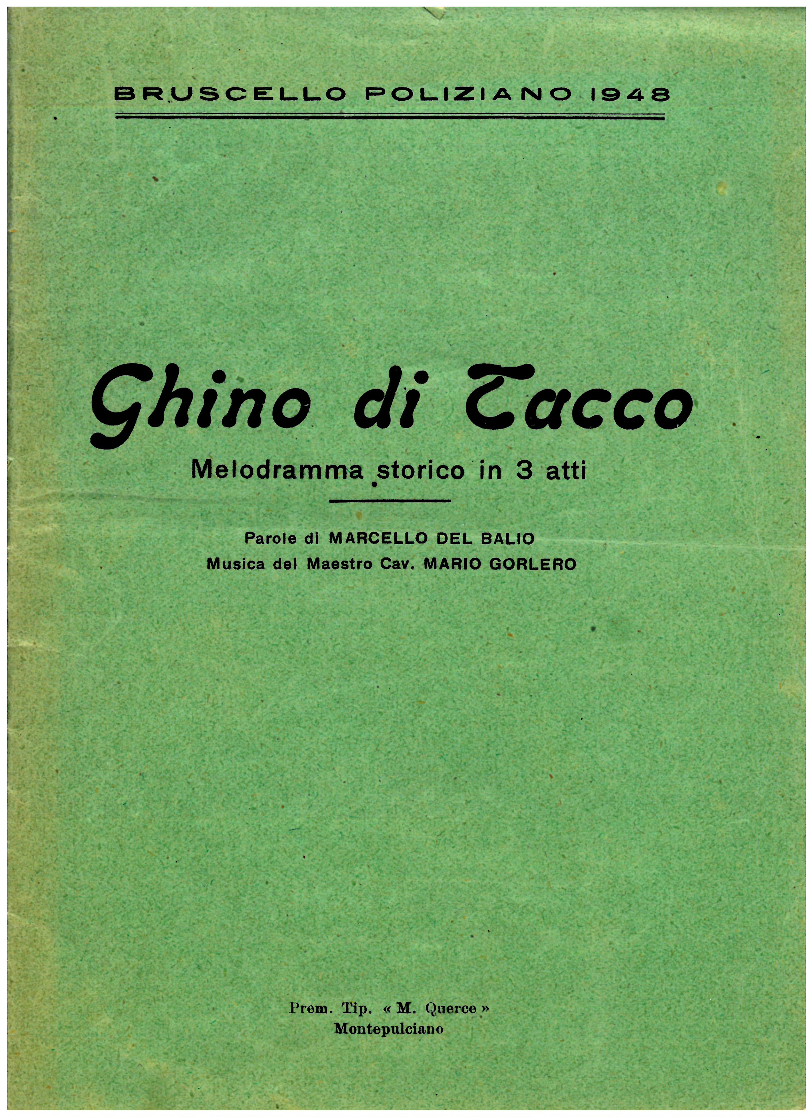 "Bruscello Poliziano 1948 "Ghino di Tacco" - Melodramma storico in 3 atti. Parole di Marcello Del Balio, musiche del Maestro Cav. Mario Gorlero", pubblicazione, s.d.