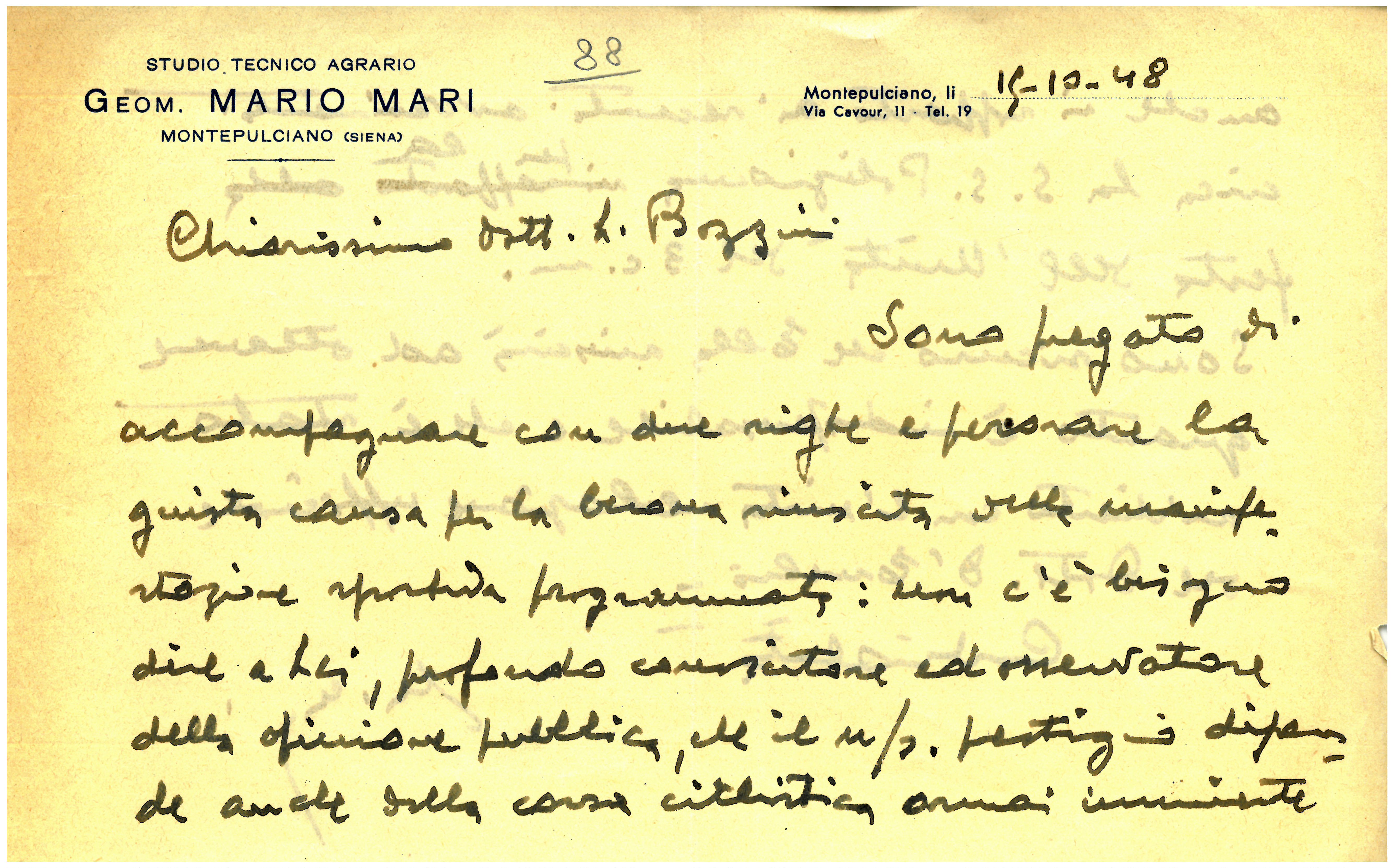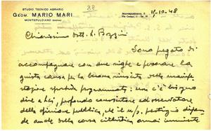 Let. a firma M. Mari su carta intestata Studio tecnico agrario geom. Mario Mari, Montepulciano, 15.10.1948