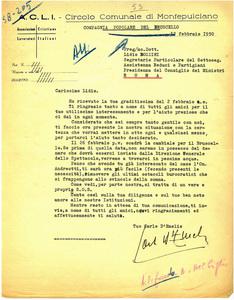 Let. a firma Carlo D'Emelis su carta intestata ACLI - Circolo Comunale di Montepulciano, 12.2.1950