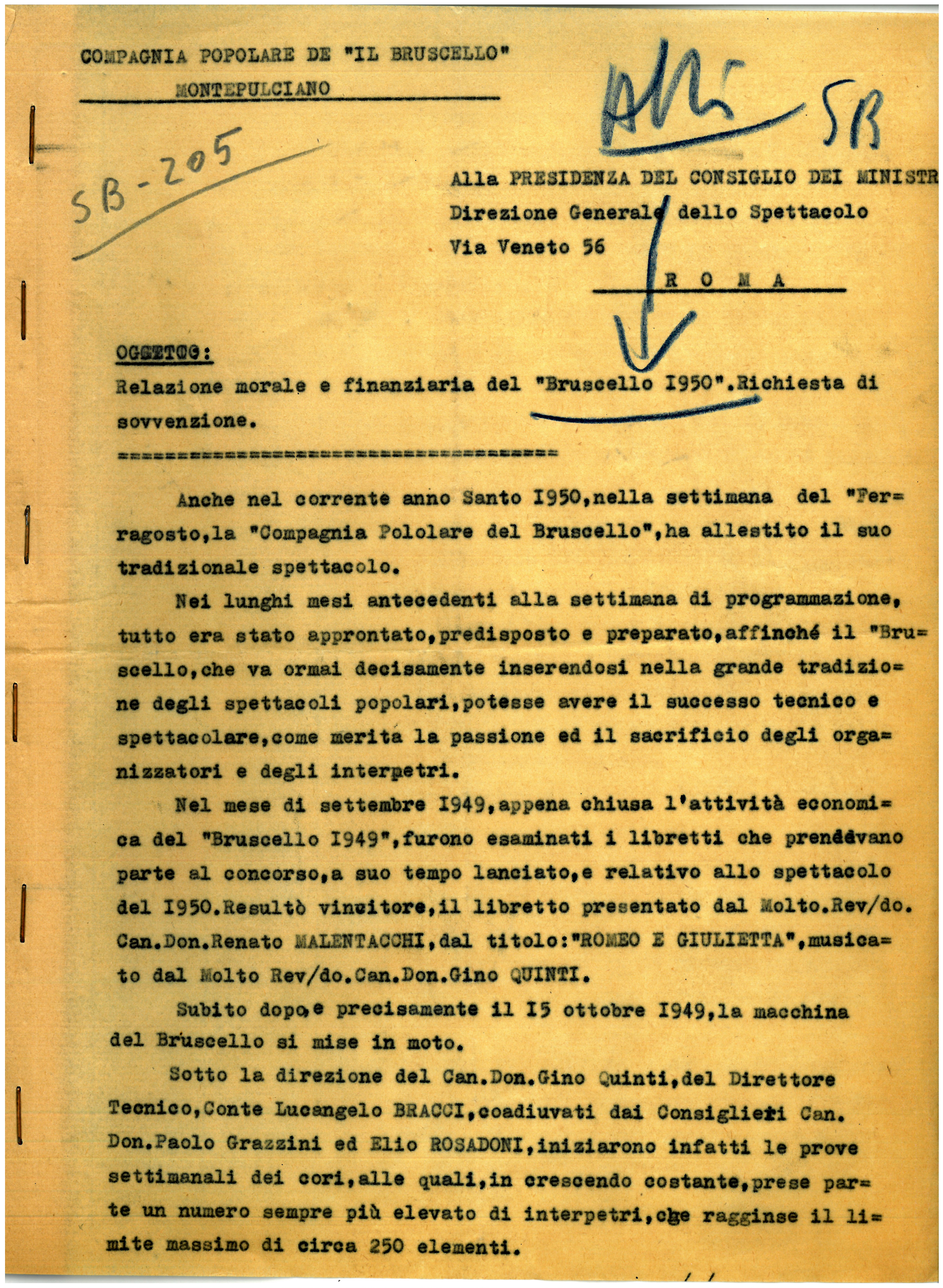 Relazione morale e finanziaria del Bruscello 1950 indirizzato alla Presidenza del Consiglio dei Ministri - Direzione Generale dello Spettacolo a firma il presidente della Compagnia Popolare del Bruscello (Carlo D'Emelis), Montepulciano, 1.9.1950