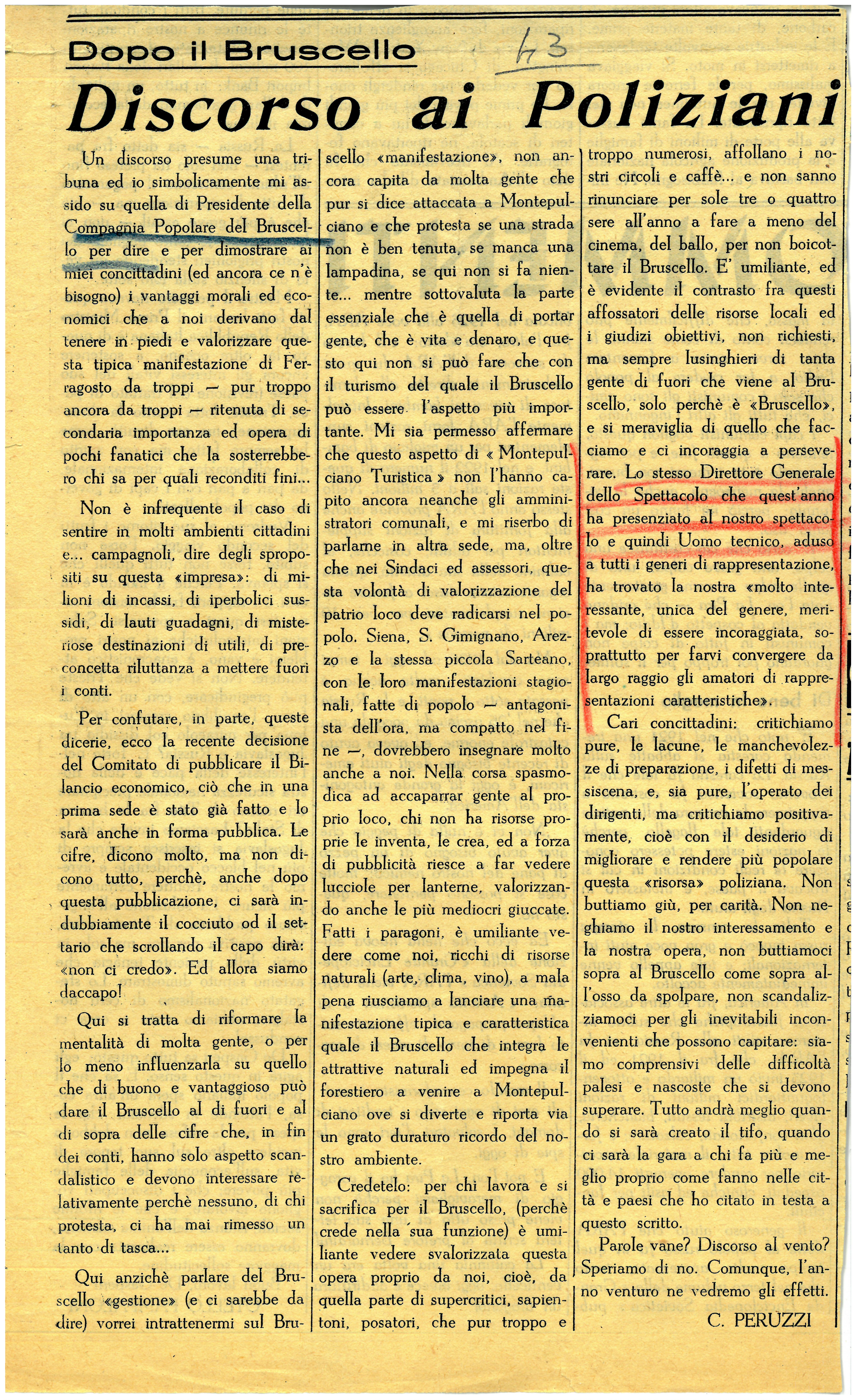 Ritaglio di articolo di giornale "Dopo Il Bruscello: Discorso ai Poliziani" di C. Peruzzi, s.d. (probabilmente da l'Araldo Poliziano)