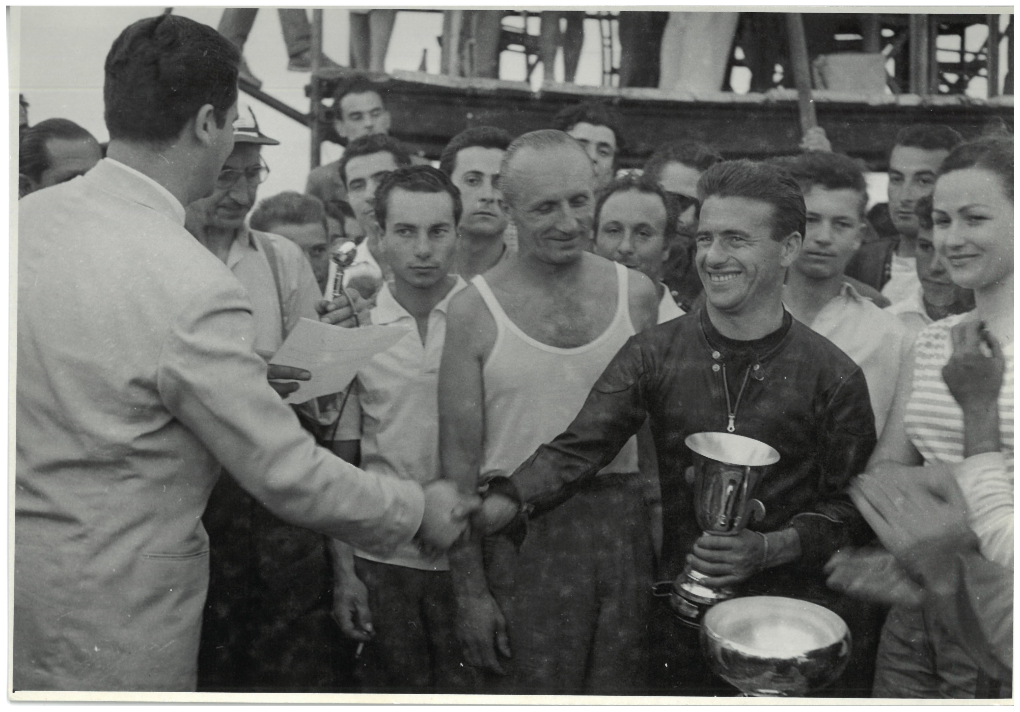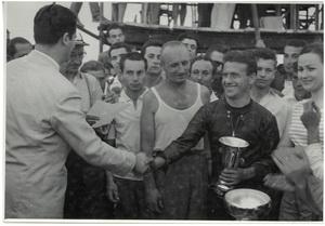 L.B. (di spalle) ad una premiazione, b/n, s.d.
