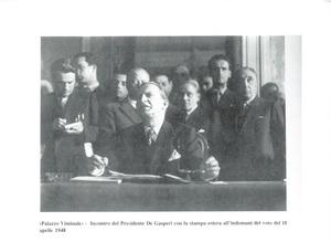 Fotocopia di fotografia durante l'incontro del Presidente De Gasperi con la stampa estera al'indomani del voto del 18.4.1948 a Palazzo del Viminale.