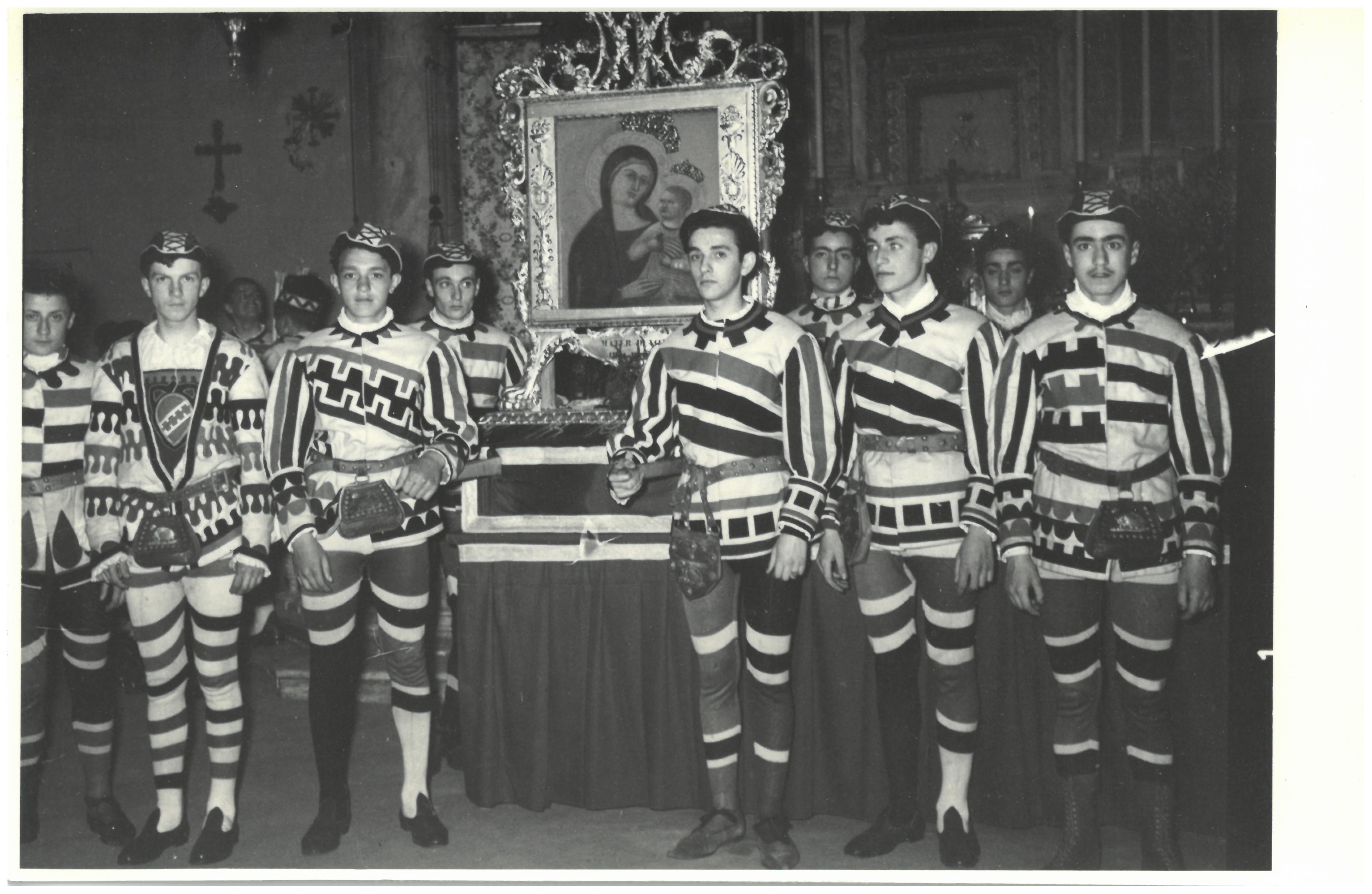Gruppo di persone n.i. durante evento legato al Palio di Siena, b/n, s.d. (sul retro presente appunto manoscritto: "10")